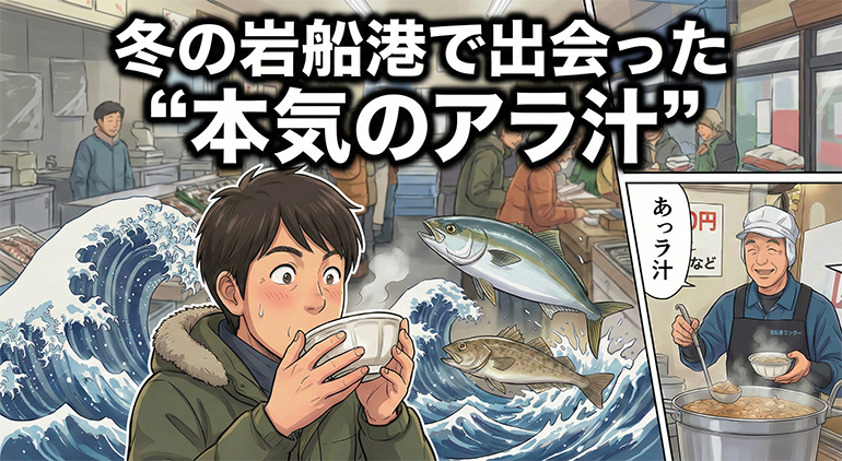 冬の日本海に吹きつける冷たい風。その寒さを一瞬で忘れさせる一杯が、岩船港鮮魚センターの入…