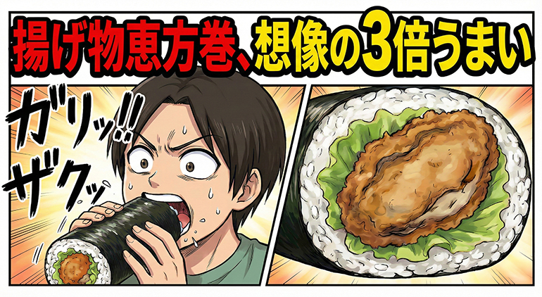 今年の恵方巻、静かに丸かじりできると思ったら甘い。南南東をきっちり測って挑んだ主人公の耳…