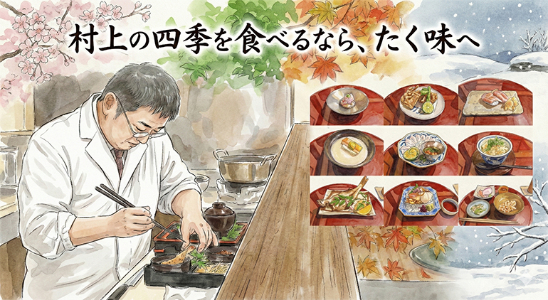 運ばれてくる一皿ごとに、新潟・村上の四季が香り立つ――。山居町に佇む「きせつ料理 たく味…