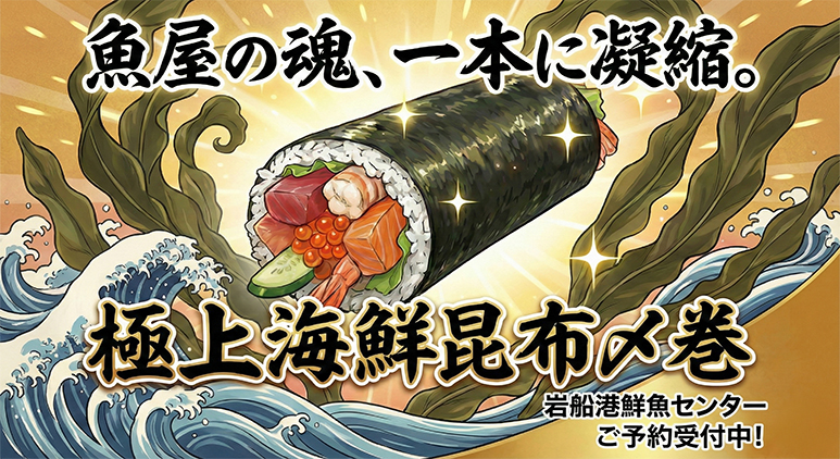 岩船港鮮魚センターの店主が手掛ける「極上海鮮昆布〆巻」は、魚を巻くだけの恵方巻ではない。…