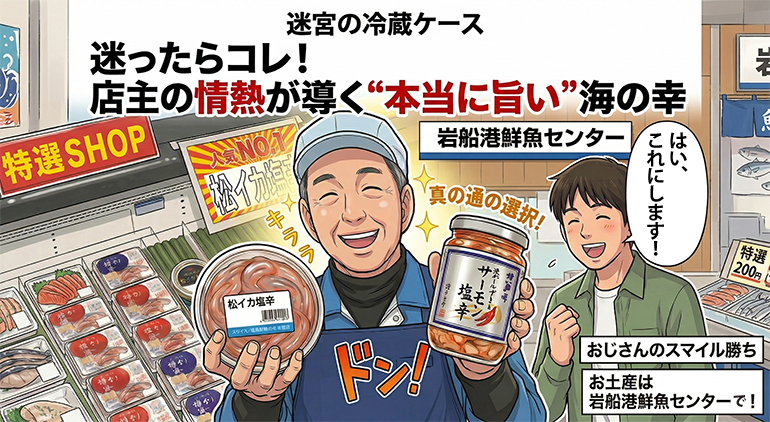 岩船港鮮魚センターの冷蔵ケースは、まるで宝箱。どれも魅力的で選べない…そんな時こそ頼りに…