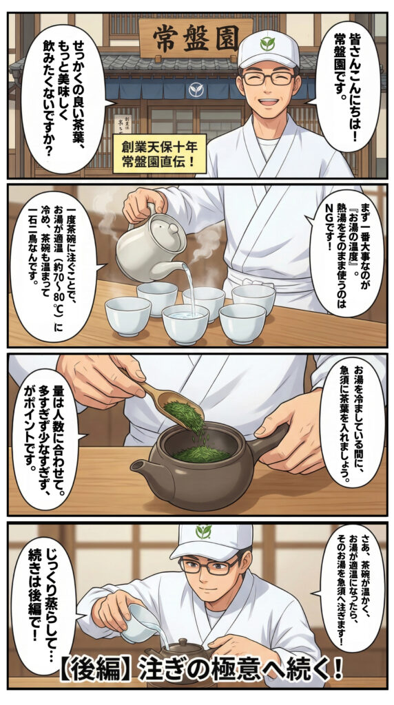 お茶って、実は“準備が8割”って知ってましたか。村上の老舗・常盤園の社長が、プロだけが知る「温度」と「茶葉の扱い」の極意を4コマ漫画でわかりやすく解説。今日からあなたの緑茶がワンランク上の味に変わります。